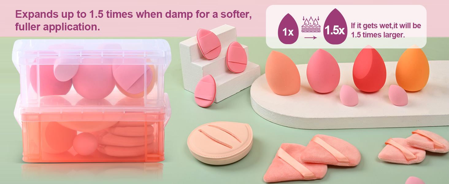 It includes 15 tools: rubycell sponges, beauty blenders, triangle puffs, and finger puffs for full-face application.